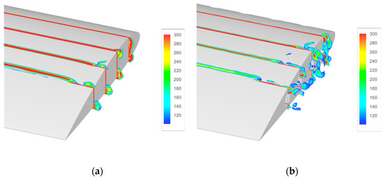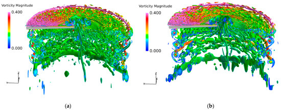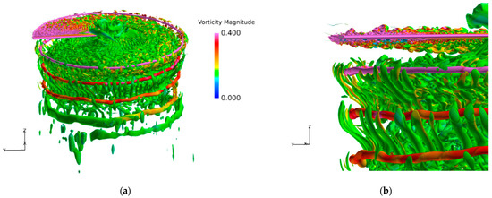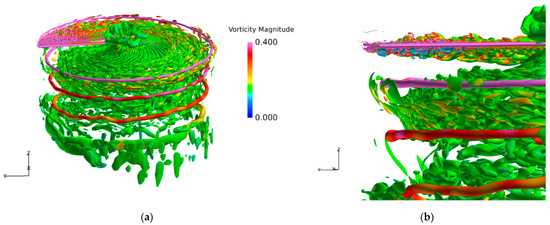 Figure 11 and Figure 12 compare the iso-surfaces of the normalized Q-criterion of the tip vortex system of the two blades, which is characterized by the normalized vorticity magnitude, and the cut view is provided in Figure 13. A pronounced difference can be observed in the vicinity of the tip vortices. Compared to RANS, with the rapid activation of WMLES mode in the focused region, the resolution of transient turbulent structures of blade tip vortices is significantly enhanced through IDDES. The behaviors of secondary turbulent structures of vortex worms around the blade tip vortices are successfully predicted, including the interactions and pairing of adjacent vortices [26]. IDDES successfully predicts the secondary turbulence structure near the tip vortex (the so−called “vortex worms”) [16]. The turbulence structure is characterized by the slender and curled shape in the vicinity of the tip vortices. The formation of vortex worms is closely related to the rotation and entrainment effect of tip vortices, and the abundance of these turbulent structure can be regarded as the characterization of vortex strength. However, depending on the resolution and parameters of the numerical method, these structures are not necessarily a specific feature of IDDES, as they can be also seen in some URANS simulations. It is observed that the number and the length of the vortex worms near the slotted tip are reduced significantly as seen in the second blade wake, indicating the weakening of the rotation effects of the vortex core.