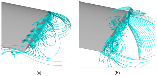 Streamlines distribution near the blade tip: (a) baseline blade, (b) slotted—tip blade.