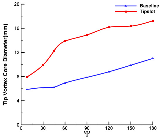 Comparison of the vortex core diameters between the baseline blade and the slotted-tip blade.