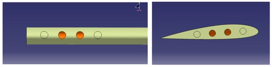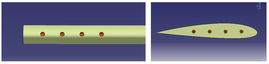 In the above sections, all the parameters of the slots, including position, diameter and number, are set according to reference [11]. However, these parameters must be adjusted for various blades under different flight conditions. This section mainly analyzes the influence of the number of slots on the diffusion effect. The number of slots is reduced from 4 to 2, while the other parameters are kept unchanged. Figure 21 shows the sketch of the two-slot model. This blade is denoted as Tipslot–2slot. Based on the grid generation method of Section 2.1, the consistency of the grid can be ensured. IDDES simulation is implemented under the same hover condition with an identical simulation strategy.
