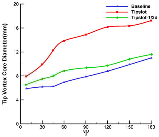 Comparison of vortex core diameters among baseline, tipslot and Tipslot–2slot blades.