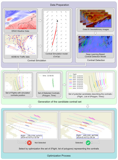 This paper is organized as follows. Section 2 describes a large set of data sources that could provide information to solve the problem. It also explains how to build the tools used to process this data: it proposes a new deep learning based contrail detection technique and a method to predict the position of the contrail produced by an aircraft at a given time. Section 3 emphasises the need for a method that solves the tracking process and the matching process simultaneously, and develops such a method. The remaining Section 4 presents the results of this process on a number of case studies, highlighting the behaviour of the method. The overall approach is summarised in Figure 1.