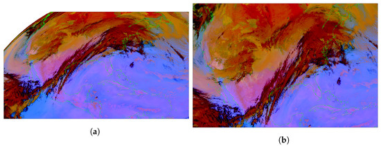 Reprojection of the satellite images: Orthographic projection centered on continental US allowing to minimize distortion. (a) Geostationary image centered on the US, corresponding to Goes CONUS product. (b) Reprojected image: the orthographic projection minimizing distortion over the US.