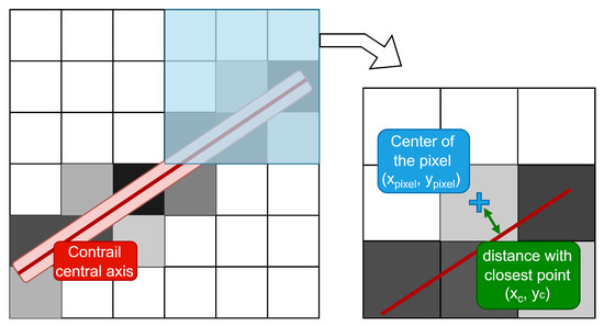 One of the main difficulties when trying to add synthetic contrails to satellite images is that the order of magnitude of the contrail’s width is usually of the order of a few pixels at most. This means that we often need to apply a color to a pixel that is only partially covered by the contrail. Using the method by Schumann [2], it is possible to calculate the contribution of the contrail to the color change of each individual pixel, as shown in Figure 3. This allows to leverage the information computed by CoCip (contrail width, optical depth…) into our synthetic dataset.