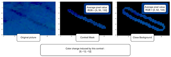 The difference between the average red, green, and blue values of the contrail pixels and those of the background is used to define the average color change induced by the contrail, as shown in Figure 4. This value will be addressed as “color difference” in this study.