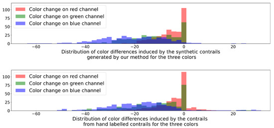 Comparison of the distributions of the color change induced by the contrail per channel (red, green blue) between the hand labelled contrails and our synthetic contrail generation method.