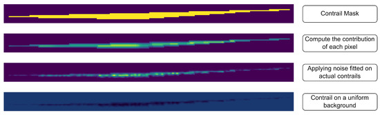 This method results in contrails that look too smooth compared to what is observed in reality. We decided to model the noise inside the contrail objects with a Gaussian noise whose parameters were fitted to the manually labeled contrails. This noise is then applied to the contrail before it is added to the final image. This process made the general shape and texture of the synthetic contrails look much more similar to real contrails. An example of the process is shown in Figure 6.