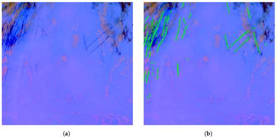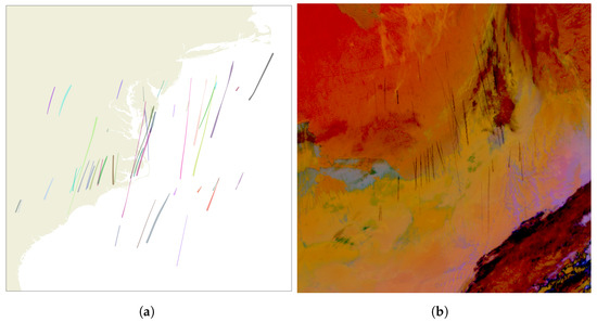Result of contrail detection on real contrails. (a) Example of an unmodified GOES tile. (b) Detected contrails on this tile.
