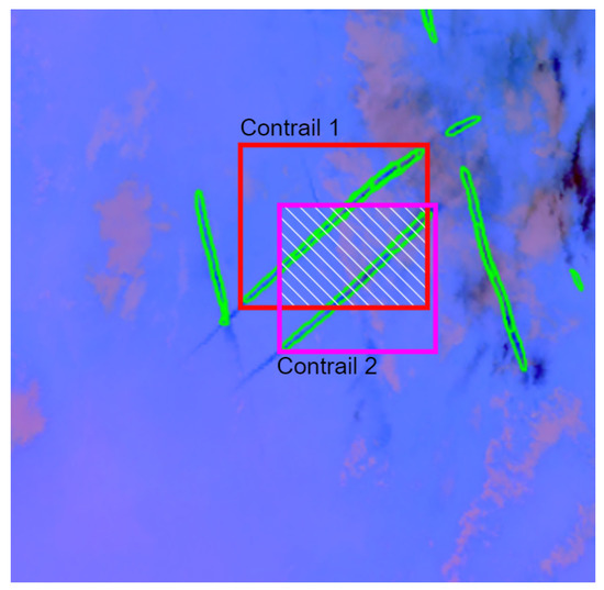The bounding boxes are overlapping: if not tuned correctly, non maximum suppression might delete the object with the lowest confidence score even if two different contrails were actually detected in the first place.