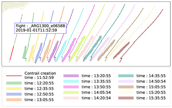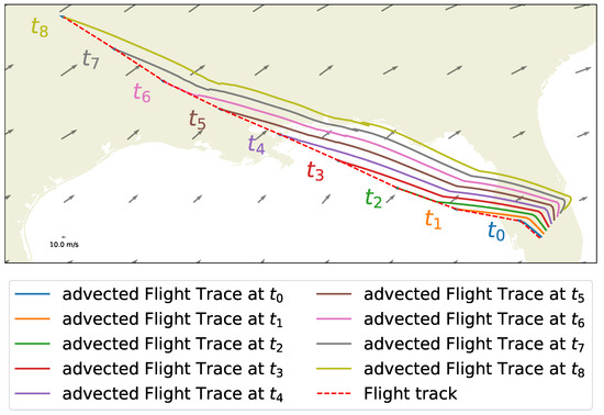 Given a detected contrail at a certain timestamp and a certain flight then such contrail will be subject to wind advection. It is possible to estimate the position of the hypothetical contrail advected by the wind at a chosen timestamp. Assuming the plane will have produced contrail all along its flight, and assuming this contrail has persisted, the position of this hypothetical contrail will be that of the flight trace advected by the wind and subject to sedimentation, that will here be represented by applying a fall speed estimated using the equations from [2]. We will call the flight’s “potential contrail” its “advected trace” from now on. This advected flight track is shown for several timestamps in Figure 11.