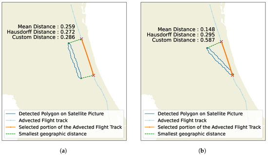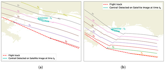 Checking the quality of the matching between a detected contrail and two different flight tracks: advected flight track at timestep 6 needs to match the position of the polygon detected at timestamp 6. (a) Simulated contrail position matches the position of the contrail detected at timestamp 6. (b) Simulated contrail position doesn’t match the position of the contrail detected at timestamp 6.