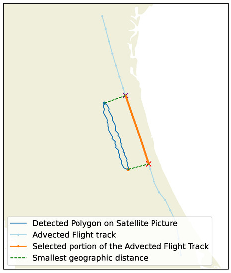 Since no information is available on which portion of the flights produced the contrail, it was assumed that the portion of the advected flight path that is closest to the polygon is the most likely to have generated the contrail, as shown in Figure 13. It corresponds to the projection of the polygon on the advected flight track. This portion of the advected flight is used to build the metrics that will allow to discriminate between the candidates. It will be called the selected portion from now on.