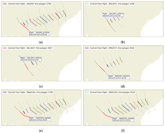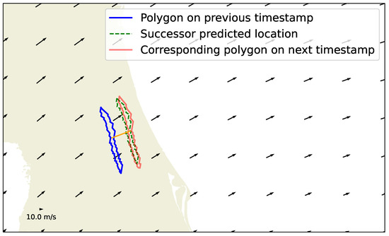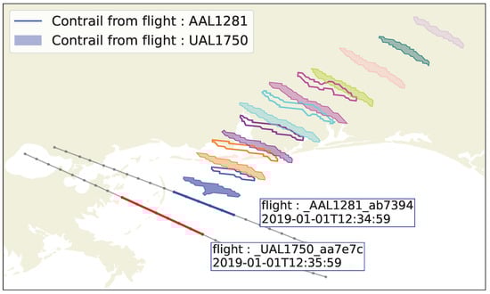 This Section will explain the methodology employed to associate a polygon detected at a particular timestamp with the flights that could have generated it. As explained in the previous section, it is possible to estimate where each flight’s hypothetical contrail would be at time , assuming the aircraft had produced a contrail at time with . Figure 12 provides empirical insights on how the matching between the flight and the contrail polygon could be performed.