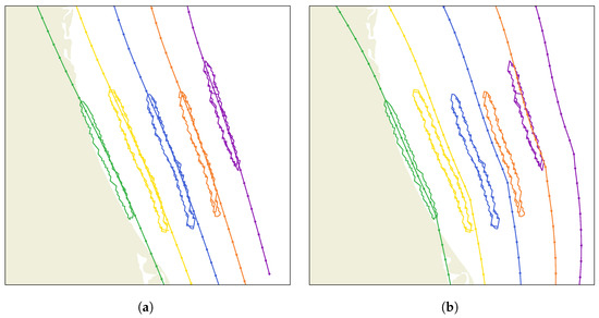 In this 8 h period, 26,394 polygons were detected on the satellite images (note that a particular contrails can be detected several times in our detection method). There are 8989 distinct flights in the ADSB traffic data over this period in the area. Using the method described above, and after filtering, Algorithm 2 allowed us to precompute a total of 16,087 distinct chains and to evaluate each one of them.