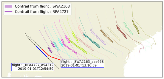 The main advantage of combining wind and traffic data in this method is the ability to distinguish between close parallel contrails from aircraft flying close to one another. If the two aircraft produce a contrail, it is possible to choose which chain of polygons is from which flight, as shown in Figure 22.