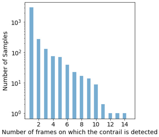Contrail observed persistence time distribution is described in Figure 20. The contrail tracked for the longer period of time lasted about 4 h in our test case. It is shown in Figure 21.