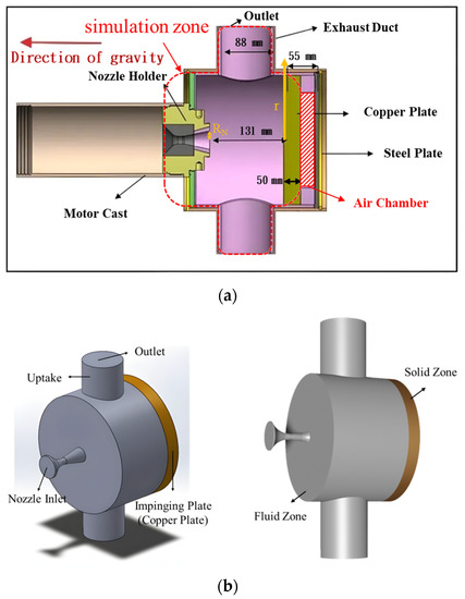To explore the relationship between the supersonic exhaust plume jet impingement flow and the thermal protection material, two analysis strategies were used to simulate the melt-ablation behavior of the copper plate in the scaled ducted launcher. The geometry of the scaled ducted launcher simulated in this study was based on a small-scale test device from the experiment of Lin [8]. Figure 1a shows a scaled ducted launcher for ablative testing in Lin’s team experiment, where the red boxed region is the simulation zone for this study. Figure 1b shows the geometry of the scaled ducted launcher from the Lin’s experiment, where the gray and bronze parts are the fluid zone and the solid zone, respectively. The geometric parameters of the solid propellant rocket motor nozzle in the fluid zone are shown in Table 1.