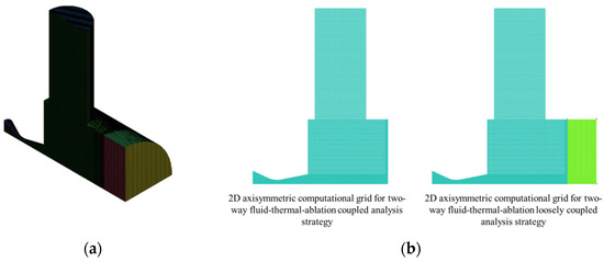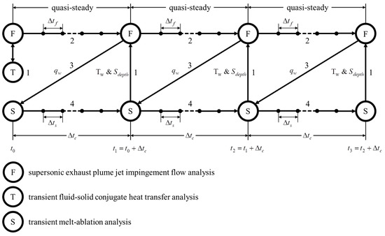 For this reason, many research teams used the loosely coupled analysis strategies to reduce computational costs while maintaining a certain accuracy of calculation results. Sun et al. [18] simulated the ablation behavior of carbon/carbon composites in a hypersonic environment through a fluid-thermal-ablation loosely coupled analysis strategy. They argued that the loosely coupled analysis strategy can avoid detailed transient aerodynamic flow analysis and, thus, reduce a large amount of computational effort, and at the same time, they also argued that the fluid-thermal-ablation coupling model can be used to provide some reference for the design of thermal protection systems. Zhang et al. [19] proposed a loosely coupled analysis strategy with the adaptive coupling time stepsize to effectively predict the conjugate heat transfer (CHT) problem in hypersonic flows. They proposed the adaptive coupling time stepsize approach based on a proportional-integral-derivative (PID) controller and embedded into the loosely coupled strategy to further improve efficiency.