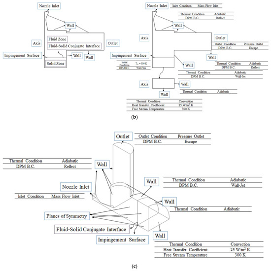 Section 2.4 and Section 2.5 introduce two numerical models that are used in the solid zone, namely, the transient heat transfer analysis model and the solidification/melting model. The transient heat transfer analysis model is divided into the transient fluid-solid conjugate heat transfer model (see Section 2.4.1 and Section 2.2.4) and transient heat transfer model (see Section 2.4.2). The former was coupled with the discrete phase model in the first step of the FTA-LCA strategy to obtain the impingement surface heat flux distribution at the steady state/quasi-steady state of the flow field. The latter was used for the FTA-CA strategy to obtain the temperature distribution within the copper plate and the melt-ablation depth profile of the copper plate. Additionally, the solidification/melting model was used in FTA-LCA strategy to obtain the temperature distribution within the copper plate and the melt-ablation depth profile of the copper plate.