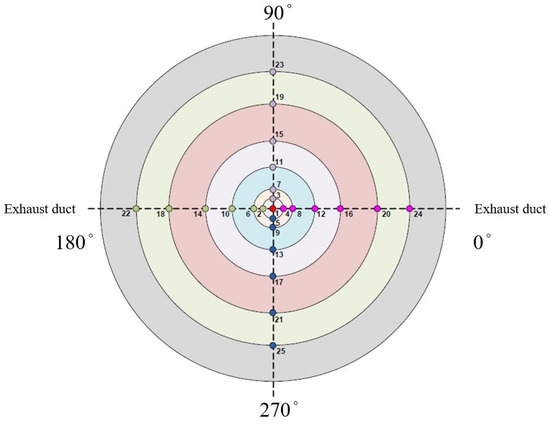 A total of 25 backside measurement points were planned for this test. Considering that only two sides of the plenum chamber had exhaust ducts, this will lead to asymmetry of the internal flow field within device. Therefore, the measurement position was divided into four directions. Its location diagram is shown in Figure 7. Except for one measurement point at the central of the specimen plate, the rest of the measurement points were 90 degrees apart on the six circles, and the radius of the circles from the inside to the outside of the position was 8 mm, 20 mm, 30 mm, 43 mm, 58 mm, and 73 mm.