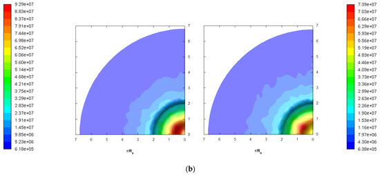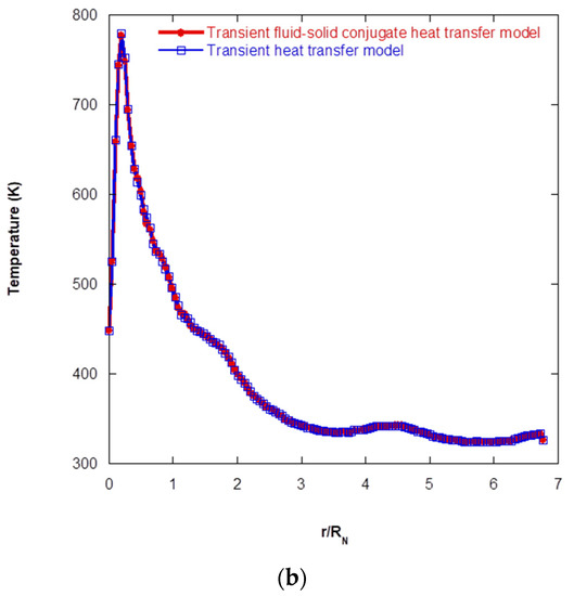 Figure 13b shows the ablation depth profiles for the 2D non-reactive flow case and 3D reactive flow case, where the burn time was 0.6 s. It can be observed from Figure 13b that the maximum of ablation depths of 2D non-reactive flow case were close for two coupled analysis strategies. Additionally, the ablation depth profiles of two analysis strategies were also very similar. Figure 13b also shows that the ablation depth for 3D reactive flow case was deeper than 2D non-reactive flow case in the range of . This was due to the peak heat flux position of 3D reactive flow case being farther away from the axis than that of 2D non-reactive flow case and the heat flux value in the range of for 3D reactive flow case being higher than 2D non-reactive flow case. Therefore, the 3D reactive flow case using the loosely coupled analysis strategy had a deeper ablation depth in the range of compared to 2D non-reactive flow case.