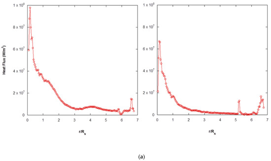 Figure 9 shows the simulation results of the scaled ducted launcher for 3D cases, which contained the impingement surface heat flux distribution for both gas-particle non-reactive flow and reactive flow cases. Figure 9a shows that the peak locations of heat flux distribution for the non-reactive flow case were similar to the reactive flow case. Figure 9b shows that the heat flux distributions for 3D cases were affected after the impingement surface recession. Additionally, the peak locations of heat flux distribution for the non-reactive flow case and reactive flow case were very close to each other.