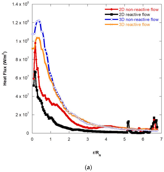Figure 10 shows the simulation results of the scaled ducted launcher for 2D cases, which contained the impingement surface heat flux distribution for both non-reactive flow and reactive flow cases. Figure 10a shows that the peak locations of heat flux distribution for the non-reactive flow case were similar to the reactive flow case. Figure 10b shows that although 2D cases were influenced by the recession of the impingement surface making the peak positions far from the axis, the peak locations of heat flux distribution for the non-reactive flow case and reactive flow case were very close to each other.
