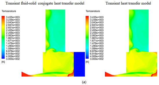 In order to confirm the transient heat transfer model can accurately calculate the temperature distribution within the impinging plate, we compared the temperature distribution within the impinging plate between the transient heat transfer model and the transient fluid-solid conjugate heat transfer model. From Figure 12a, it can be seen that the simulation results calculated by the transient heat transfer model and the transient fluid-solid conjugate heat transfer model were very close to each other. In addition, Figure 12b shows that the impingement surface temperature distributions for both heat transfer models were nearly the same at simulation time t = 0.01 s (i.e., burn time was 0.01 s). The result was expected. This was due to two models differ only in the discretization method and numerical method. Therefore, the results of the two models should be similar or even identical. After confirming that the simulation results of the two models were the same, we calculated Equation (33) through the UDF code and simulated the melt-ablation behavior of the copper plate by using the dynamic mesh technique. This method is called the two-way FTA-CA strategy in this study.