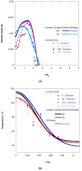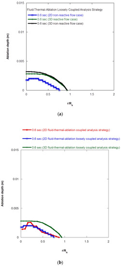 Figure 13a shows the ablation depth profiles for the 2D and 3D cases in two-way FTA-LCA strategy, where the burn time was 0.6 s. We can observe from Figure 13a that the ablation profiles of the 3D reactive and 3D non-reactive cases were very close to each other, and the difference between their maximum depths was only 0.4 mm. The ablation profile for 2D case was slightly smaller than that for 3D non-reactive case, and the difference between their maximum depths was only 1.2 mm.
