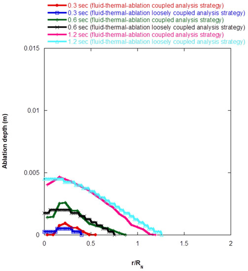 In this study, the ablation depth profiles of the copper specimen plate were obtained by using two analysis strategies. The size of the coupling time stepsize used in the FTA-LCA strategy affected the simulation results. For this reason, the results of the two-way FTA-LCA strategy were compared with those of the two-way FTA-CA strategy to confirm the reliability of the simulation results of the two-way FTA-LCA strategy. Finally, the accuracy of loosely coupled analysis strategy was confirmed by comparing the ablation depth profiles obtained from the FTA-LCA strategy with the experimental results of Lin [8].