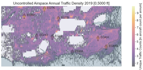 Scaled annual traffic density in uncontrolled airspace in Southern England for the year 2019.