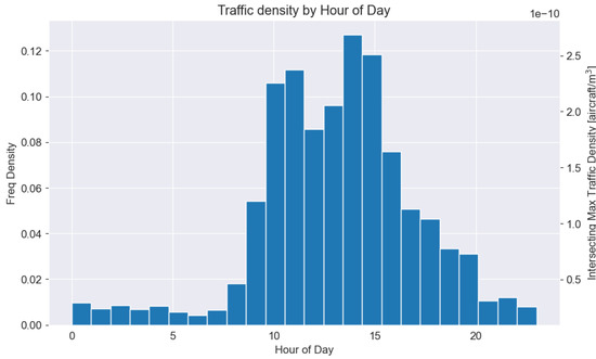 The operation was selected to take place at 1400 h. This is the busiest time of day in the operational area, shown by Figure 2, accounting for a relative frequency of 0.1218. The traffic density for the operational area is shown in Table 1. The values represent the traffic densities for a mean day across the time horizon of the data, in this case one year, within the entire operational area and for only the cells that the trajectory intersects. Figure 2 also shows the maximum traffic density of all intersecting cells by hour of day on the right vertical axis. This results in a max traffic density of aircraft/m corresponding to the operation time of 1400. The minimum and mean values for the intersecting traffic densities are aircraft/m and aircraft/m, respectively. However, the realistic worst case was desired; therefore, the maximum intersecting traffic density was used.