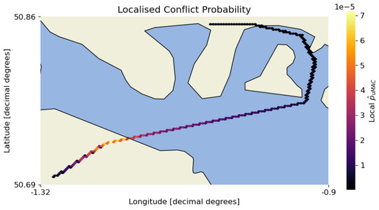 The localised conflict probability is shown in Figure 7. As expected, this is seen to correlate with the traffic density map in Figure 5. This allows for further refinement of the path to avoid identified high uMAC risk regions of the originally intended flightpath.
