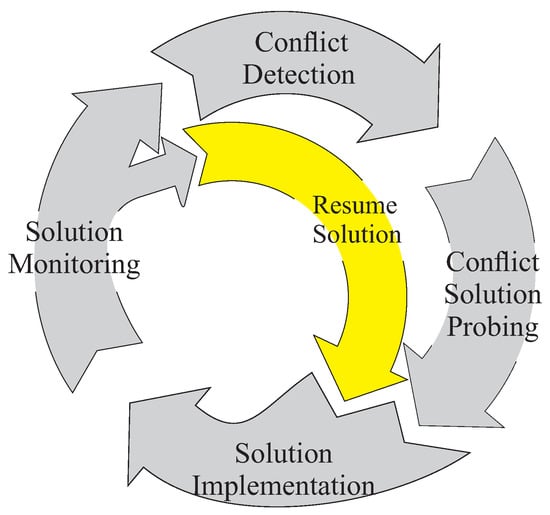 To investigate the support for our proposed approach and its identified work phases, we related it to the work steps in the CLC model. We found correspondences between the phases and the CLC work steps. Here, Phase 0 best matched conflict detection, while Phase 1 best matched solution monitoring. From the previous discussion and data interpretation, we assumed that solution monitoring and solution implementation are strongly alternating activities covered by Phases 2 and 3. These processes cannot be sharply separated with the built model because of the high frequency of changes between them.