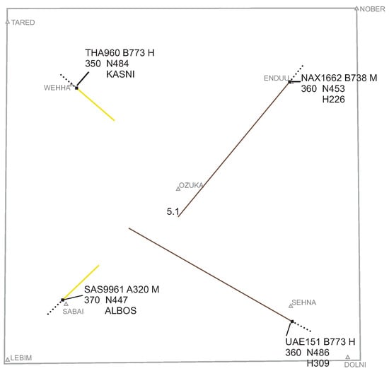 The NARSIM simulation platform was used as the en-route ATC simulator to run the chosen scenario. The primary working instrument involved a 2D situation display (“radar”-like) of the respective sector, showing the aircraft as squares with trailing dots to indicate direction on the horizontal plane, sector borders, and waypoints. The interface provided support tools in terms of speed vectors, a separation tool (sepTool), and a conflict display window. The activity of the controllers during the simulations was logged by the simulator, which included clearances given, aircraft conflicts selected, and the activation of sepTool. In addition, the screen positions of the graphical objects, such as the aircraft representations and the simulator conflict-detection tools, were also logged. Aircraft representations included the aircraft tracksymbol, clickable information label, and various movement-related graphical elements (which could be turned on and off) to symbolise direction and separation distance.