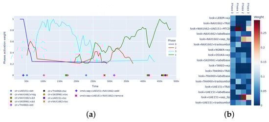 Figure 5b, the event patterns featuring the discovered work phases tended to be described in terms of look events. The main reason for this was that clearances and other types of commands given by the controller are infrequent when compared to look events, e.g., an ATCO may give four or five clearances, while she/he may have looked dozens of times at a waypoint. This drawback of our current method can be addressed by using a measure based on term frequency–inverse document frequency (tf-idf) when training a topic model, instead of the term frequency used now. The measure tf-idf captures rare words in a corpus and, consequently, facilitates the integration of less-frequent events, such as clearances, in the patterns. Moreover, boosting the possibility of including rare events in the patterns’ description also makes it easier to investigate the correlation of commands with the phases, e.g., whether certain commands act as triggers for the end of one work phase and the start of another. For instance, we visually inspected the phases’ activation graphs, for the 14 controllers in our study, in conjunction with commands to add (remove)