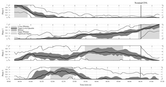 Figure 6 depicts four time-distributed boxplots, each involving the median, lower, and upper quartiles, as well as the lower and upper whiskers in one diagram. Each of the boxplot diagrams is associated with a work phase. This was calculated using the respective phases of 14 participants and indicated the cross-participant variance over the period of the trial. By comparing the variance across participants and time in this way, the systematic progression of the phases became clear, with periods alternating with each other and high- and low-amplitudes becoming apparent. This suggested that phases featured certain periods of dominance, indicating prevailing working patterns and related cognitive modes, as outlined by the CLC model.