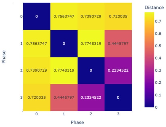 Figure 7 depicts the results obtained in this study. It shows that Phases 2 and 3 were the most-similar (lowest distance), while Phase 0 was quite distinct from all other phases. We could say that Phase 3 shared characteristics with Phases 1 (e.g., look at the