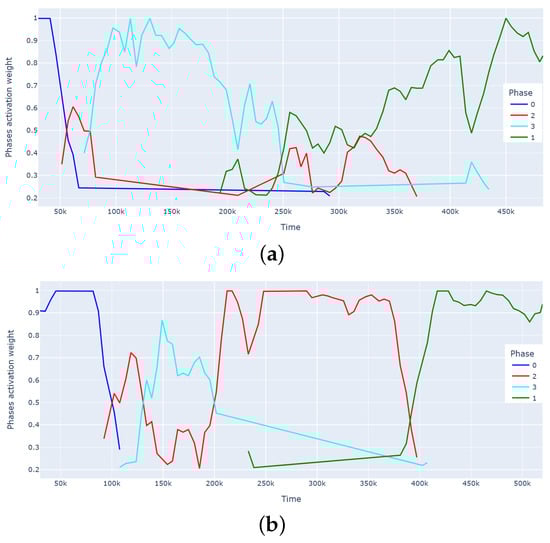 . The per-window phase assignments are called here the phases’ activation weight (which correspond to the probabilities retrieved by the model). We observed that, during the first 57 s, Phase 0 was activated to be then replaced by a short time period where Phase 2 dominated (for