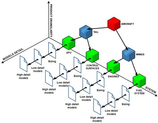 It can be noticed that each of those simulations represents a step into the design process, usually requiring an increase in development and computational time and allowing for the comprehension of additional aspects of the real object. Therefore, the level of understanding with respect to the behaviour of the real system increases at each modelling step. Additionally, each specific model is often developed within a dedicated simulation tool, which might exploit a numerical solver incompatible with other ones, or a different format. Thus, passing through different disciplines and/or tools becomes often problematic and cumbersome. This is a first issue in integrating physical models if one considers the so-called “vertical” or multi-tool integration. A second barrier to overcome is the property of a system such as an aircraft to be a “system of systems”, meaning that it is composed of multiple complex systems [40], each with their own sub-systems and components, as it can be seen in Figure 2.