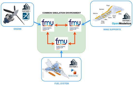 Regarding the current application, being contextualised in a practical industrial environment, one of the main requirements was to enable the compatibility between models from different modelling environments, which are derived from the multiple tools that a wide consortium of companies may employ. Therefore, the best option to this end was the Co-simulation FMU, which allows exporting a model to any other simulating environment. An example of an application of such an approach in a wide industrial context is proposed in Figure 5.