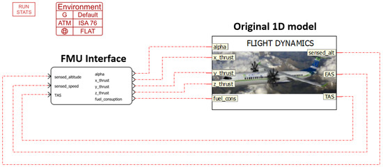 In order to achieve this, the different models developed for each system were adapted in order to make them compatible with the FMU interface but without changing any previously modelled elements. In Figure 6, an example is shown of how an AMESimTM super-component can be prepared for the export as an FMU. It can be seen that the “FLIGHT DYNAMICS” block is the super-component including the model for the simulation of the dynamics of the aircraft, including its aerodynamic characteristics during flight, with its input and output variables. Then, we added a fictitious block (on the left) which is the FMU interface block: its function is to define which variables the FMU, once exported, must exchange with the external environment.