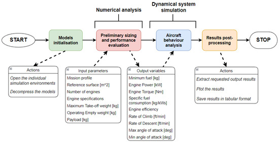 Such a process consists of two main steps: the numerical analysis for preliminary sizing and the dynamic verification through a dynamical model. The latter is the exact same one presented in Section 3.1, which is composed of the dynamic model integrated through the application of the FMU protocol. The numerical analysis, instead, refers to the process of preliminary sizing of the main systems of the aircraft based on set flight conditions, in terms of flight path, passengers on-board, payload and other user-defined parameters, as reported in Figure 9. Such a step is originally conducted through the use of a MATLAB® script that, through the use of multiple sizing functions, one for each system, allows obtaining a preliminary configuration of the aircraft in terms of total mass, fuel on-board, engine thrust and many more. In the traditional design process, all the data captured from this step would be then manually transferred to the dynamic verification model in order to test that the generated aircraft configuration is capable of completing correctly the set mission. Through the use of this integration, as it can be again seen in Figure 9, such a task is performed in a completely automatic manner, allowing for the simulation of the dynamic model to start as soon as the data from the preliminary sizing are inserted in the correct location. The model will then be able to simulate the behaviour of the aircraft based on a set architecture and configuration, without any discontinuities in form of data extraction and exchange.