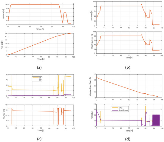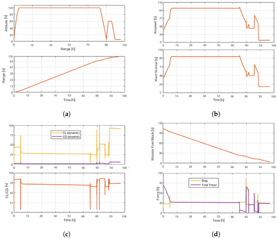The results from the reference simulation of the test case aircraft. (a) Mission profile; (b) Velocities; (c) Aerodynamic coefficients; (d) Fuel and drag/thrust.