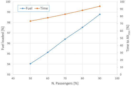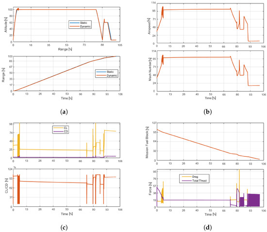 Analysing the plot of the mission profile in Figure 12a, several phases of can be clearly identified. As it has been presented earlier, the dynamical model of the aircraft includes, after the take-off, an immediate climb, which is followed by a long cruise and a descent to lower altitude. After the first stage, a second flight step follows, which is composed of a climb, a cruise at lower altitude and a final descent. The mission terminates through a loiter flight at constant altitude. Each phase can be investigated exploiting the other plots in Figure 12. For instance, in Figure 12d, it can be noticed that during the climb, the thrust plot decreases due to the lower air density at higher altitudes. During the cruise, instead, it remains almost constant, since the atmosphere conditions remain the same, as the air speed of the aircraft does, as reported in Figure 12b. Finally, during the last phases, the thrust more significantly varies, decreasing in the descent and increasing during the climb. Meanwhile, the on-board fuel shows an almost linearly decreasing trend due to the continuous use along the mission, with a slightly lower consumption during the descent phases. The model was then used in the proposed interoperability approach presented in Section 3. Therefore, we performed a multi-system integration through the generation of the FMUs and then further integrated it in a multi-tool workflow for the vertical automatisation of the design process. The expectation is that the plots presented here will not change much, since the two integration steps are intended to be as transparent as possible with respect to the simulation itself.