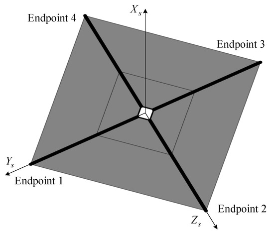 Figure 3 shows the ontological coordinate system of the solar sail. The origin is located at the center of mass of the solar sail spacecraft. The -axis is parallel to the normal direction of the sail surface and deviates from the direction of the Sun. The -axis points towards the direction of the boom connected to end point 1 on the sail surface. The -axis and the other two axes together form a right-handed right-angle coordinate system. The -axis is defined as the roll axis of the GPDSS, and the -axis and -axis are defined as the pitch and yaw axes, respectively.