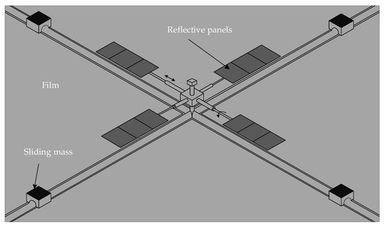 Polar displaced solar sails are always controlled using three-axis stabilization, whereas a solar sail for triaxial stabilization is generally a square sail with booms [4]. So far, there are three main ways to obtain torque for attitude control studies of solar sails [5,6]: adjusting the center of mass (including sliding masses [7,8,9,10] and gimbaled masses [11,12,13,14]); adjusting the center of pressure (including sail panel translation/rotation [15,16,17,18,19,20,21,22], control vanes [23,24] and reflectivity modulation [25,26,27,28,29,30]); and passive stability design (seeking to stabilize solar sail geometry in the presence of SRP [31,32]).