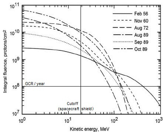 The flux of the first class of particles goes under the name of Solar Radiation. Solar flares are called Solar Particles Events, or SPE. The average energy spectrum (see Figure 1) has a power law distribution ranging from fluxes ~109–1010 protons/s with energy of order of a few MeV (depending on the event), to 107/s for the highest proton energies (of order 100 MeV).