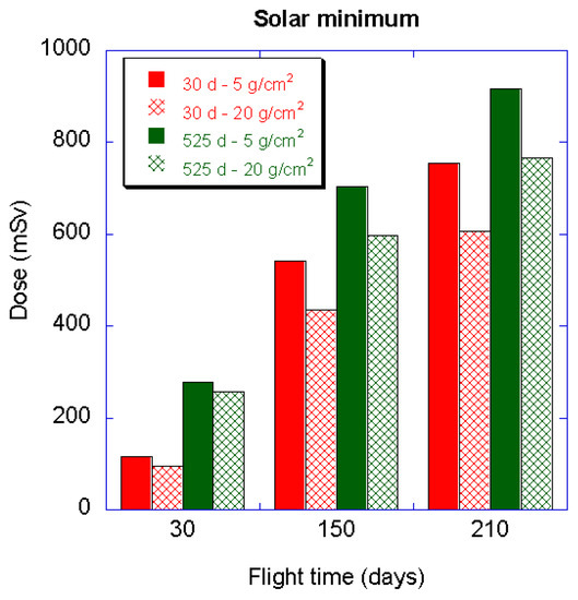 Note that SPEs must be withstood in such a small shelter for 1–2 days, albeit very uncomfortably. A Mars mission with chemical propulsion depends on planetary ephemerids and trajectory, but the chemical propulsion Isp < 4500 m/s dictates a fast Hohmann trajectory with transit time between 6 and 10 months like for the MSL mission cited. Therefore, the crew dose is in the range of a significant fraction of Sv but must be combined with that absorbed during the forced stay on Mars, estimated in the 240–300 mSv per year [9]. Although the relationship between dose and risks is still subject to uncertainty, the magnitude of the dose discourages transit times longer than a few months, see Figure 2. This Figure is for the 12-year solar minimum cycle that corresponds to higher solar proton flux, interfering with GCR. Changing assumptions may change the values, but the general conclusion holds, namely, that transit times ~1 year pose unacceptable dose risks.