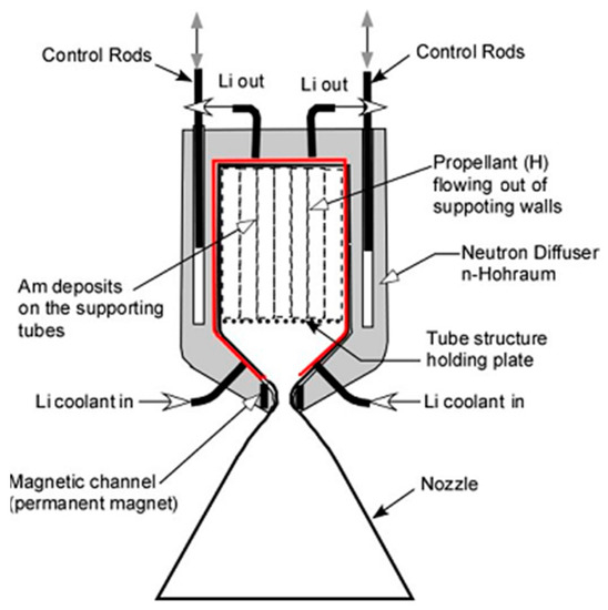 With the assumptions made, the calculated Rubbia’s engine-powered mission round trip is 369 days (a 150 day and 178-day journey with 41 days on the surface) while that calculated with the LOX/H2 rocket is 998 days (two 359-day journeys with 480 days on the surface). The latter needs approximately 300 metric tons of resources for four astronauts, compared to 109 metric tons for the nuclear-powered mission. The Rubbia’s Engine or its module is shown notionally in Table 1. The actual engine would employ the second law of thermodynamics to maximize the application of available energy to power the spacecraft. The main features of a Rubbia’s engine are shown in Figure 4 [18]. It can be noted that the difficulty with a continuous thrust but low power trajectory is the time required to spiral from Earth and spiral into the Martian sphere of influence. In [18], it is stated “using an optimum (Hohmann) Mars approach, the insertion velocity is unacceptably large, meaning that spacecraft velocity should be reduced well before entering the Martian sphere of influence”. That implies that the mass and volume for a chemical propellant system should be included in their respective budgets to both move quickly away from Earth and quickly achieve an acceptable Mars insertion velocity, if a rapid departure from Earth and a quick capture into a nearly circular Martian orbit are to be achieved.